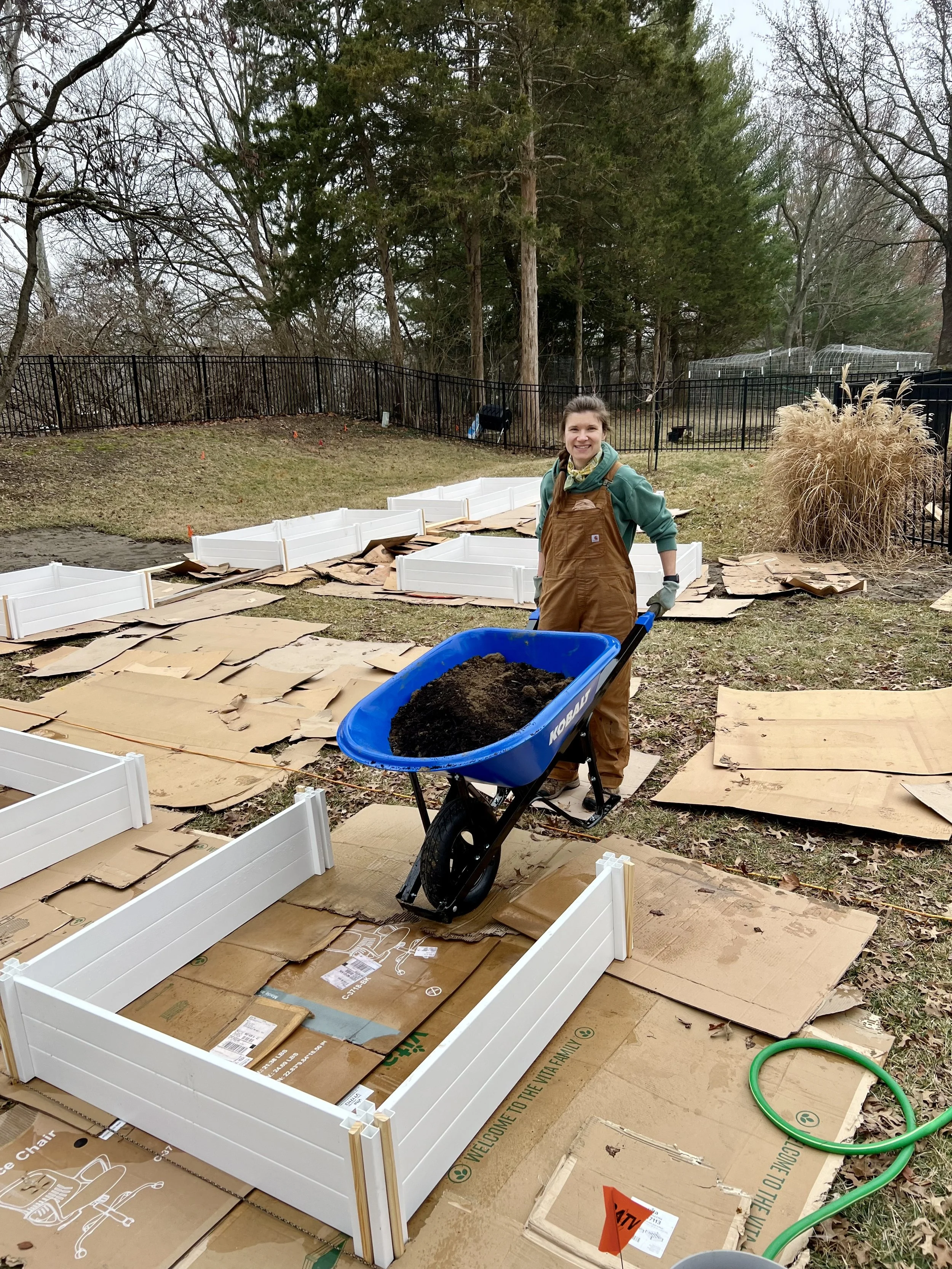 We ordered raised beds from Vita, many, many yards of soil and compost, as well as lots of woodchips for paths between the beds. We spent several weekends shoveling and carting all of the soil until the garden was finally ready to go.